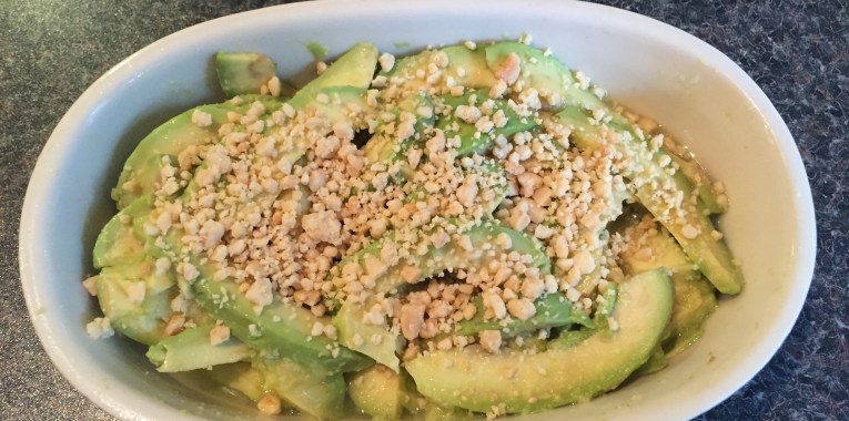 When ready to serve, garnish with the slice avocado and pour over the dressing