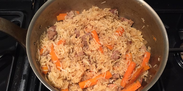 Transfer the chicken and rice to a serving dish (either leave the chicken pieces tossed in with the rice, or place the chicken on top of the rice), and sprinkling with 1-2 tablespoons of rosewater (optional)