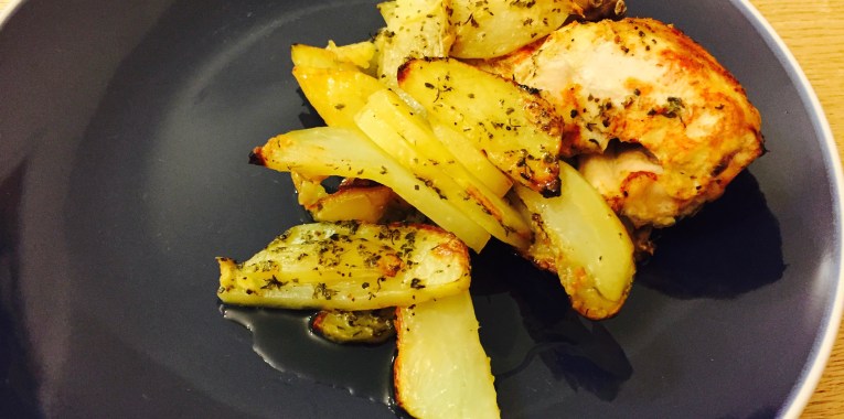 Rub the chicken pieces with the mashed garlic all over (reserve 1/2 tsp for the potatoes) and place in a casserole dish