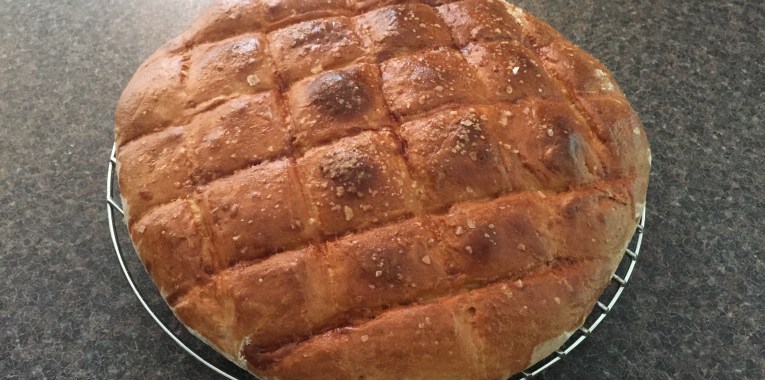 Slovenian cuisine is a mixture of the Central European cuisine (especially Austrian and Hungarian), Mediterranean cuisine and Balkan cuisine. Recipes I came across include Jota (meat and vegetable hot pot), Ričet (Slovenian Barley soup), Idrija Žlikrofi (dumplings), Čompe s skuto (potatoes with cottage cheese), Prekmurska gibanica (layered cake), Potica (nut bread), baked mushroom with cheese and Kranjske Klobasa (sausages). I opted to make Belokranjska pogača (salted cake), which although quite doughy it was really tasty.