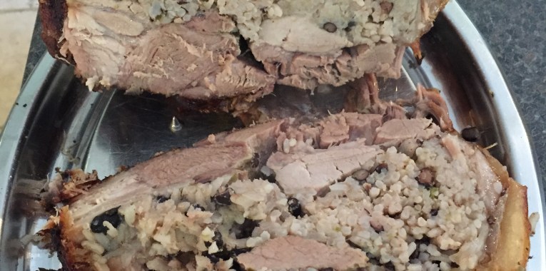 Spread Moros y Cristianos down the middle of meat and fold to fully cover stuffing. Tie with a string both lengthwise and across.