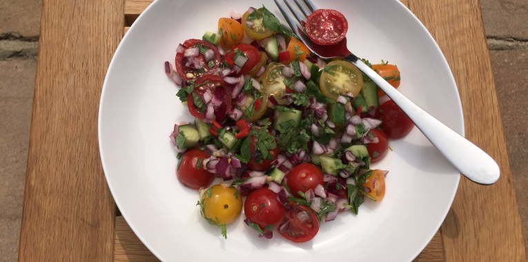 The cuisine of Rwanda is based on local staple foods produced by subsistence agriculture such as bananas, plantains, pulses, sweet potatoes, beans, and cassava. Recipes I came across during my research Rwandan Fruit Salad, Umutsima (a dish of cassava and corn), Isombe (cassava leaves with aubergine and spinach), Mizuzu (fried plantains), Rwandan Beef Stew, Ugali (African Cornmeal Mush) and Pinto Beans and Vegetables. I opted for Kachumbari (tomato, onion and avocado salad) which made a very tasty lunch.